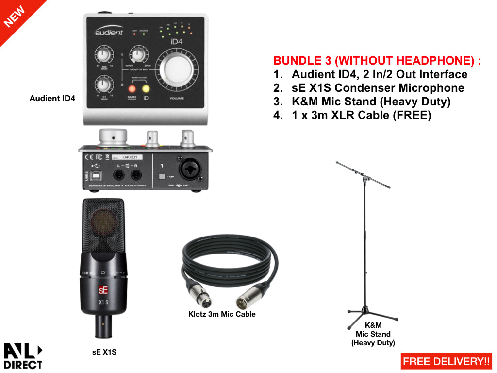 We combine sE Electronics best microphones with Audient Audio Interface, along with a 3m XLR Cable that comes for FREE. Ensuring your microphone doesn't fall off, we bundle it with a heavy duty boom microphone stand from K&M. Lastly giving you the well known headphones from Sennheiser.